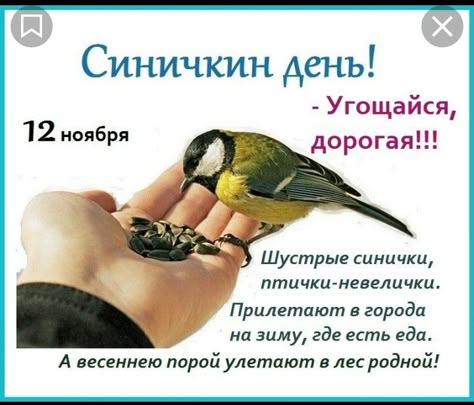 Дети узнали, что с давних пор на Руси в ноябре 12 числа отмечается Синичкин день. Ребята узнали об истории этого праздника, народных приметах и интересных фактах, связанных с синицами, отгадывали загадки о зимующих птицах, поиграли в игры: «Хочу быть птичкой», «Веришь-не веришь», «Птичьи профессии». Также говорили о том, что зима – очень тяжелое время года для птиц, нашим пернатым друзьям бывает холодно и голодно. Чтобы согреться птицам необходимо много есть, а еды им нужно зимой намного больше, чем летом. Поговорили о правилах постройки кормушек и подкормки птиц, в том числе и «синичкины лакомства»: несоленое сало, нежареные семечки тыквы, подсолнечник. Ведь помогая птицам, мы делаем Доброе дело не только для зимующих птиц, но и для себя. Заботясь о птицах зимой, мы заботимся о природе.